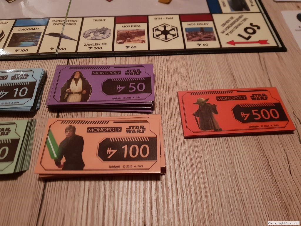 Die Monopoly Star Wars Edition: Häufen Sie Ihre eigenen Planeten und Raumschiffe an, bauen Sie Siedlungen und neue Städte und wählen Sie die helle oder die dunkle Seite der Macht. Darüber hinaus tauchen Sie mit 16 Sith-Karten und 16 Jedi-Karten tief in die Welt zwischen Hoth und Naboo ein und können mit optionalen Pasch-Regeln Ihre Jedi-Macht steigern.Inhalt: Spielplan, 28 Besitzrechtkarten, 16 JEDI-Karten, 16 SITH-Karten, Geldscheinhalter, 1 Satz STAR WARS-MONOPOLY-Geld, 32 Siedlungen, 12 Städte, 2 Würfel, Anleitung